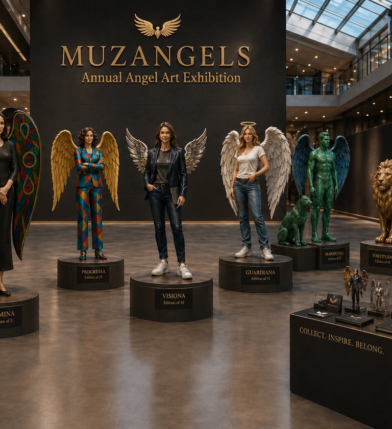 Over time, MUZANGELS can grow into an annual art event with paintings, sculptures, limited editions, prints, books, objects, apparel, collector releases, and curated auctions — bringing together art collectors, patrons, founders, angel investors, and creative communities around the enduring power of belief before proof.
